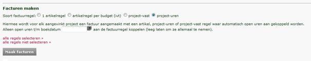 Vanuit deze lijst is het mogelijk om de openstaande projecturen direct te factureren. Vink de betreffende project(en) aan en kies onderaan de lijst de factuurregel “project-uren”. Vervolgens klikt je op “maak facturen”.