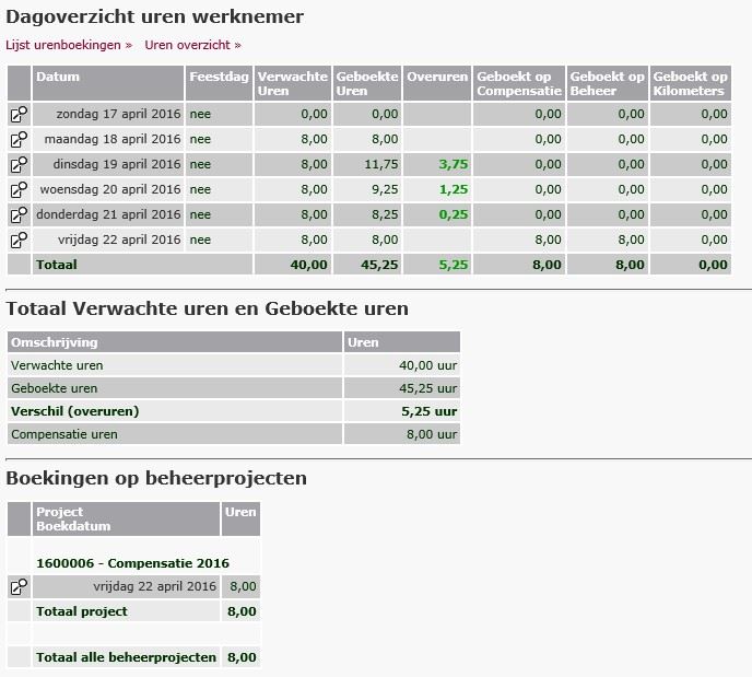 Je kunt in het dagoverzicht een periode vergelijken hoeveel overuren er zijn gemaakt en hoeveel iemand heeft gecompenseerd.